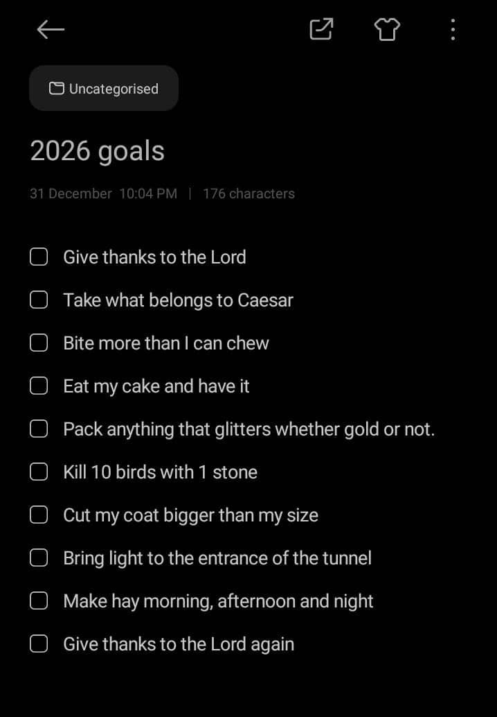 You want to see yourself grow? Do the things you don’t even believe you can do. Sign up for that oratory contest. Join that basketball team. Take that ICAN exam. Start that podcast. Build that business. Do big things this year, my friend. Bite more than you can chew — na your jaw go expand!